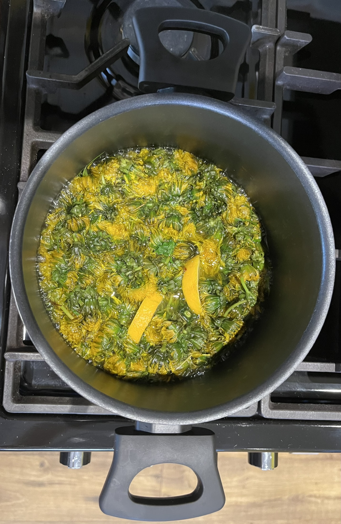 - Put dandelions, water, and the lemon in a pan to simmer for 15 minutes.